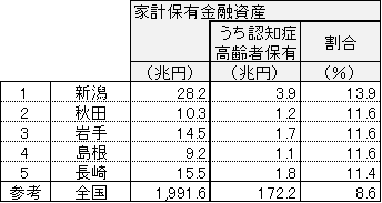 認知症高齢者が保有すると推定される金融資産を見ると、東京都に次いで、神奈川県16.3兆円(9.5%)、大阪府12.3兆円(7.1%) 、愛知県11.2兆円(6.5%)、埼玉県10.8兆円(6.3%)となり、この5都県で全国の40.3%となり、上位10エリアまで広げると59.5%。三大都市圏に集中していることが分かります。