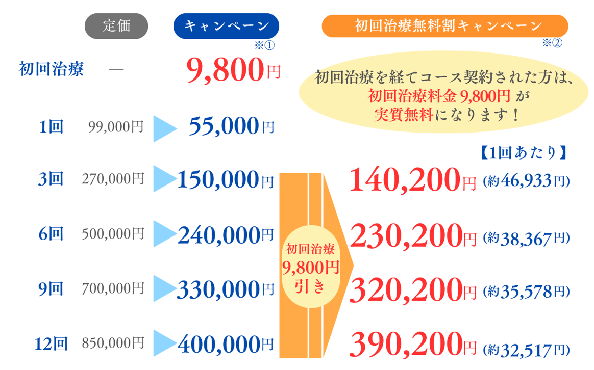 ・初回治療を経てコース契約時にコース契約金額(初回治療キャンペーン価格)から初回治療料金分(9,800円)を引いての会計になります。