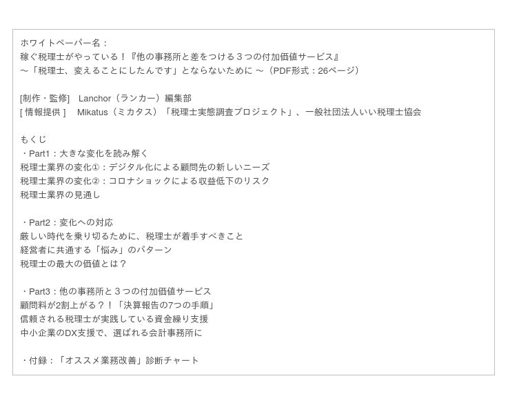 本ホワイトペーパーは、税理士による付加価値サービスの提供をテーマにした資料です。