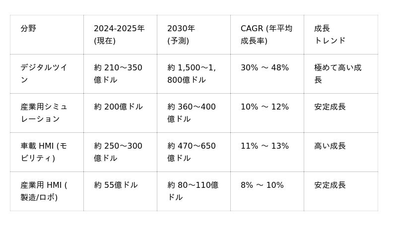 ※市場規模データ出典:Gartner「Digital Twin Market Report 2025」、IDC「Industrial Simulation Market Forecast」、Forrester「3D Visualization Trends」