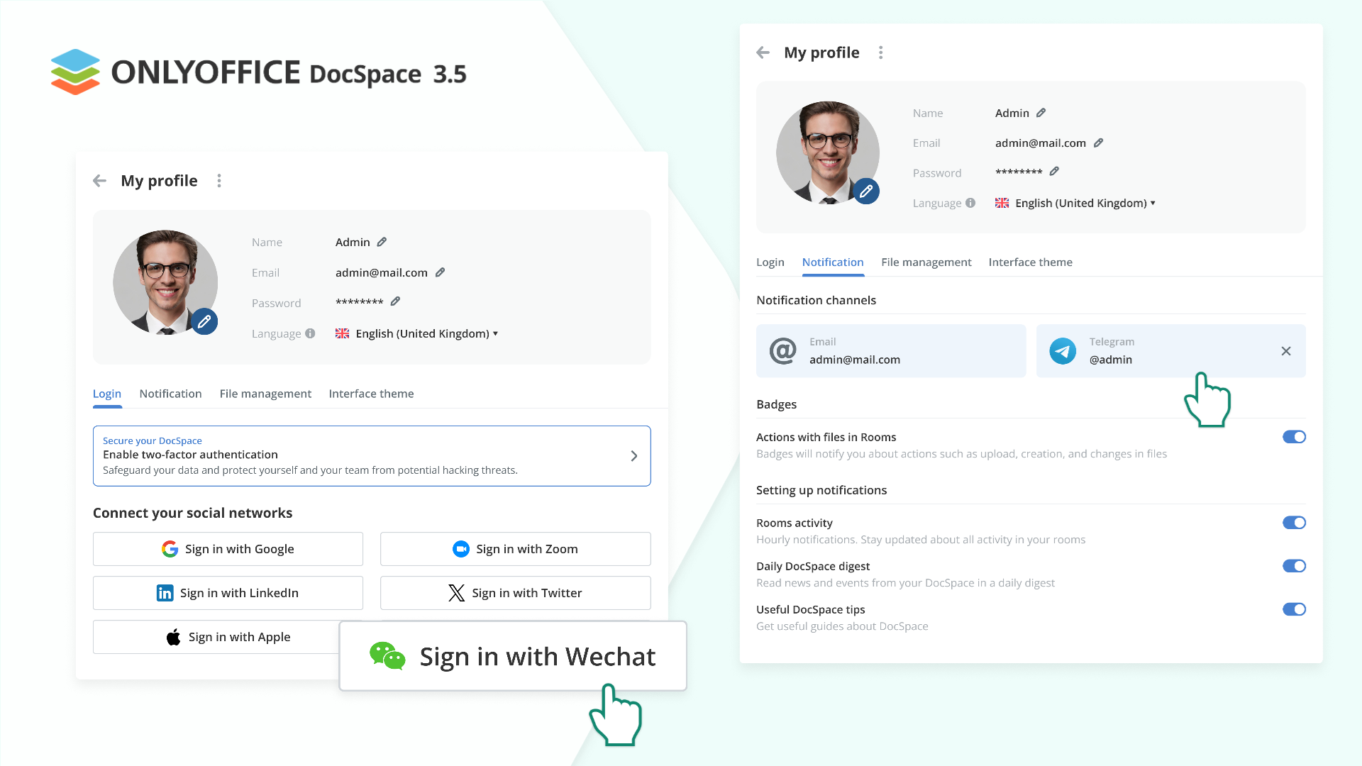 さらに、WeChatによるログインがサポートされたほか、コラボレーションの効率化を目的に、Daily Feed・ルームアクティビティ・メンション通知をTelegramに直接送信できるようになっています。