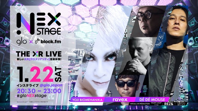 DE DE MOUSE、ravex、YOJI BIOMEHANIKA出演! 2022年のNew Year Event「glo NEX STAGE presents THE XR LIVE」が開催決定
