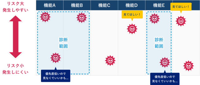 この手法では、診断対象となる機能に対して網羅的に診断項目を検証するため、ビジネス上は優先度の低い脆弱性の調査にも工数が割かれてしまうケースもありました。また、スコープを行うために見積開始から発注までの時間的コストや工数がかかってしまう、診断対象となる機能が、本来診断範囲とすべき対象から狭くスコープされてしまうといった課題もありました。