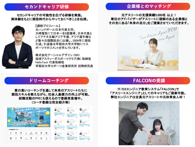 プロの世界や五輪・世界大会で活躍したトップアスリートが多数参加している『ドリームコーチング』との協業を通して、引退後のセカンドキャリア支援だけでなく現役時代からのサポートが実現可能となります。
