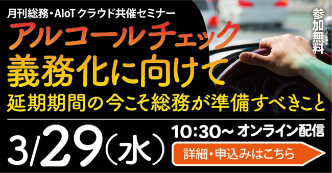 株式会社月刊総務(代表取締役社長:豊田 健一、以下「月刊総務」)と、株式会社AIoTクラウド(本社:東京都江東区、代表取締役社長:石黒 豊、以下:AIoTクラウド)は、『アルコールチェック義務化に向けて 延期期間の今こそ総務が準備すべきこと』をテーマに2023年3月29日(水)に無料Webセミナーを開催いたします。登録サイトはこちらhttps://www.g-soumu.com/learning/articles/seminar20230329