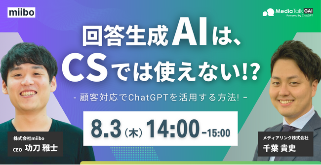 ChatGPT連携チャットボット「MediaTalkGAI」や、代表電話を自動化する「DXでんわ」などを提供するメディアリンク株式会社(本社:東京都港区、代表取締役:松本 淳志、以下 メディアリンク)は、会話型AI構築プラットフォームmiibo(ミーボ)を運営する株式会社miibo(本社:東京都渋谷区、代表取締役:功刀 雅士、以下 miibo)と合同で8月3日(木)14時〜ウェビナー開催することをお知らせします。