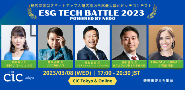 ESG TECH BATTLE 2023は、NEDOが2021年度に新たに創設した、プレシード・シード期の研究開発型スタートアップ、研究者、起業家のためのピッチコンテストの第二弾です。対象はエネルギー・環境分野をはじめとしたESG関連領域であり、最優秀者には賞金100万円を授与するとともに、優秀者には副賞としてCIC Tokyoによる1年間の事業成長サポートとCIC Tokyoの利用権を付与します。また、審査員特別賞:経済産業省産業技術環境局長賞、NEDO賞、CIC Tokyo 会長賞が授与されます。