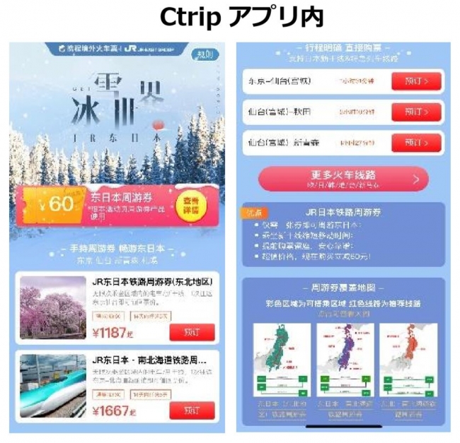 中国国内に3億人の会員を持つ「Ctrip」のアプリおよびウェブサイトと、JR東日本が中国市場向けに設定する冬のウェブサイトにて、スノーアクティビティを含む旅のコンテンツの情報を発信します。中国旅行市場向けに、日本の東北の魅力を伝えるとともに、JR東日本の鉄道パスなどの鉄道サービス購入を促進します。