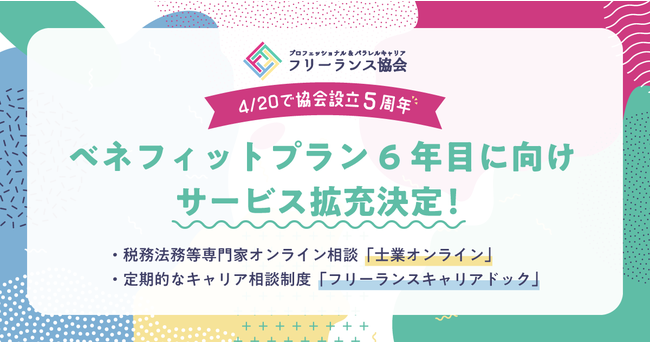 自分の名前で仕事をしたい人のための非営利支援団体一般社団法人プロフェッショナル&パラレルキャリア・フリーランス協会 (東京都中央区、代表理事:平田麻莉、以下「フリーランス協会」)は、法人設立5周年を記念し、いつも協会の活動を支えてくださっている一般会員(有料会員、ライト会員も含む)向けのベネフィットプランを、年間1万円の年会費は据え置きで拡充します。
