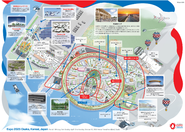 大阪・関西万博の大型会場図や、パビリオン情報を