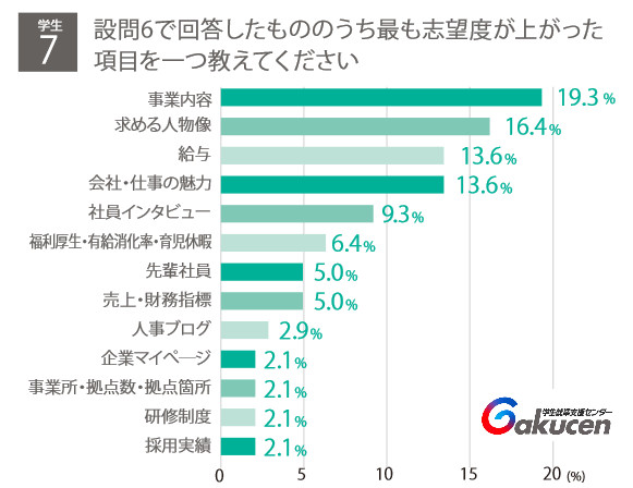 また、最も志望度が上がった項目についても上位の回答項目(『事業内容』19.3%、『求める人物像』16.4%)の順位は変わっていませんが、『会社・仕事の魅力』(12.1%→13.6%)などの有効性が上昇しています。