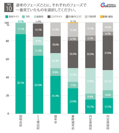 設問10では、学生が選考の各フェーズでナビサイト以外のどんな情報源を参考にしていたか聞きました。グラフでは情報源の変化が視覚的に読み取れます。