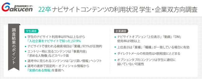 22卒ナビサイトコンテンツの利用状況 学生・企業双方向調査 主な内容