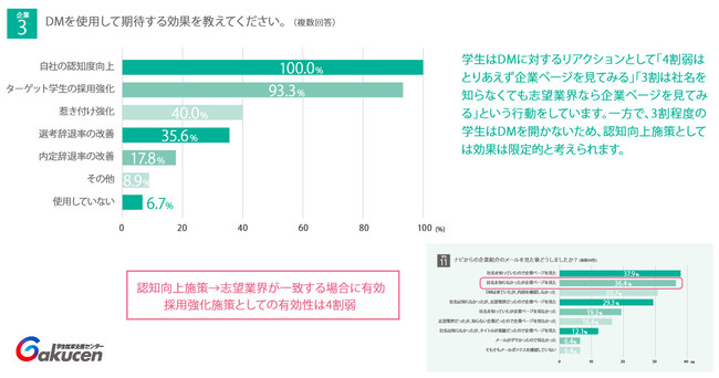 回答は『自社の認知度向上』100%、『ターゲット学生の採用強化』93.3% が多数を占めました。