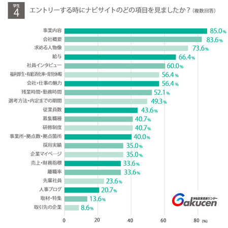 エントリー企業を選ぶ際に多く参照されていたコンテンツ項目は『事業内容』85.0%、『会社概要』83.6%、『求める人物像』73.6%、『給与』66.4%が上位を占めました。