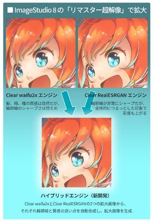 (3) ハイブリッドエンジンは、「Clear waifu2xの質感」と「Clear RealESRGANのシャープな輪郭線」を合成する新開発のテクノロジーにより、それぞれの長所を併せ持ったさらに高品質で美しい拡大画像を自動生成する超解像エンジンです。