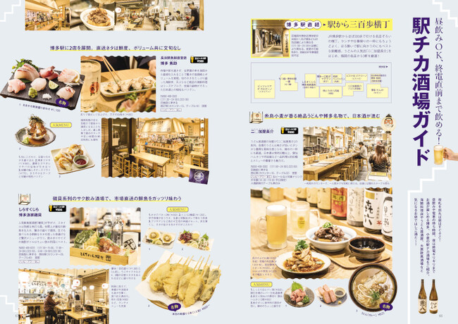 ■昼飲みOK!終電直前まで飲める!「駅チカ酒場ガイド」博多駅、天神駅、小倉駅の3大ターミナルに近接する駅ナカ&駅チカの酒場をご案内します。新鮮な海の幸やこだわりの逸品、お手頃価格の博多名物など、多彩なジャンルの専門店を紹介しているので、何を食べようか困った時にも重宝します。ちょっとした待ち時間や休日の昼飲み、出張&観光、仕事終わりの普段使いと、駅までのアクセス至便な飲み処へGO!