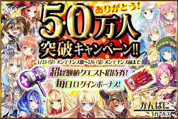 DMMゲームズ【代表:片岸 憲一(かたぎし けんいち)】と、DMM.com OVERRIDE【代表:梨木 勇介(なしき ゆうすけ)】は、ファンタジーRPG『かんぱに☆ガールズ』にて、登録者数50万人突破を記念いたしまして、1月23日(金)より「50万人突破キャンペーン」を開催しますことをお知らせいたします。