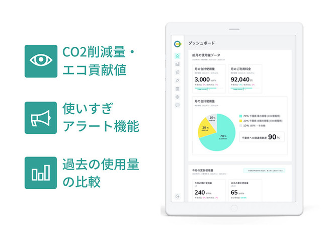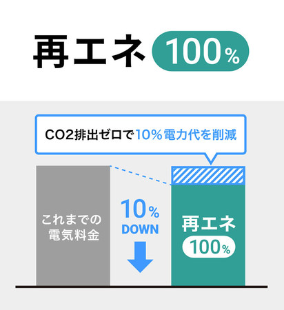 CO2排出量ゼロの再生可能エネルギー100%の電力でありながら、平均10%のコストダウンも実現し、再エネ=高いというイメージを覆します。