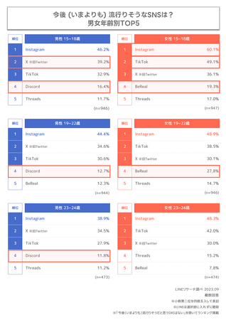 【LINEリサーチ】今後いまよりも流行りそうなSNSの総合1位は「Instagram」で5割弱、4位に「BeReal」がランクイン