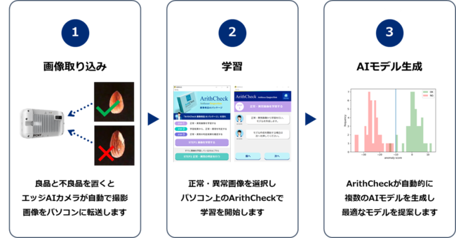 Arithmerの検品パッケージ「ArithCheck」は、工業品や食料品等の不良検査・検品作業の効率化、精度向上を支援し、検品ミスを低減・解決するものです。独自のアルゴリズムを基にユーザーがお持ちの画像に合う精度の高いAIモデルを短時間で生成することが可能です。また、シンプルなUIによりAIが初めてのユーザーでも簡単に本製品を使用できます。