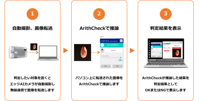 本システムは、5G・ローカル5Gをはじめとした無線通信に対応し、過酷な製造現場の環境下でも長時間の安定稼働が可能なFCNTの「エッジAIカメラ」と、学習用のサンプル(良品と不良品)を準備するだけで、ユーザーが自ら、簡単かつ短時間でAIモデルを生成できるArithmerの検品パッケージ「ArithCheck」を連携させることで実現した、初めてAIを導入する製造業などのユーザーが手軽に始められるAI検品システムです。