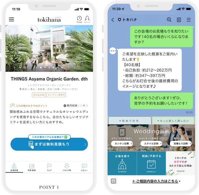 トキハナは花嫁の不安を“トキハナツ” 式場探しをコンセプトに、新郎新婦と結婚式場をオンラインでマッチングするサービスで、式場414、ベンダー135が参画しています(2023年7月11日現在)。