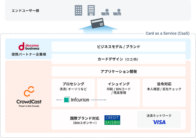 クラウドキャスト株式会社 (本社:東京都千代田区、代表取締役:星川 高志、以下「クラウドキャスト」) は、自社ブランドの法人カード発行を希望する企業 (以下「提携パートナー企業」) が、次世代法人Visaカードを最短90日でリリースできる新サービス「Card as a Service (CaaS)」を発表しました。本サービスの採用によって、提携パートナー企業は、独自デザイン、アプリケーション、ビジネスモデルの法人カードを低コスト短納期で発行することができ、ビジネスを迅速に展開し、お客様に新たな付加価値を提供することができます。