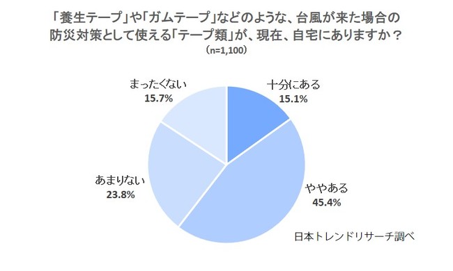 まずは、「養生テープ」や「ガムテープ」などのような、台風が来た場合の防災対策として使える「テープ類」が、現在、自宅にあるかについて聞きました。