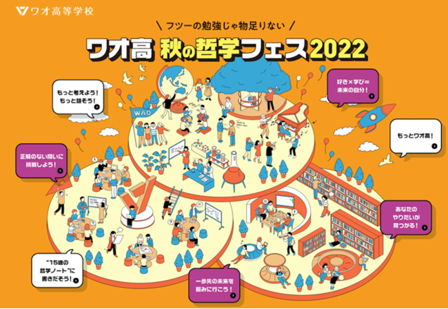 「ワオ高 秋の哲学フェス 2022」では、 “正解のない”10個の問いに挑む「続・ジューダイクエスト」に加えて、「普通って何?」「公平って何?」日常の出来事を話し合える「哲学カフェ」、自分の頭で考えるトレーニングができる「15歳の哲学ノート」など、楽しく哲学を学べるプログラムを展開します。