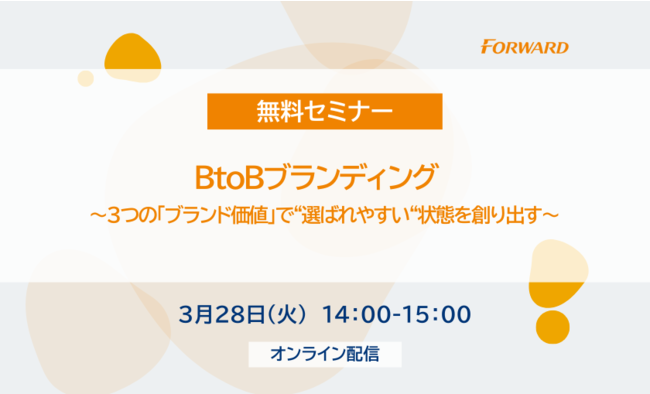 企業のブランド戦略を支援する株式会社フォワード(本社:東京都中央区、代表取締役:伊佐 陽介)は、無料セミナー「BtoBブランディング」を2023年3月28日(火)にオンラインにて開催致します。(詳細・お申込みはこちらから:https://www.forward-inc.co.jp/seminar/2023/03/28)