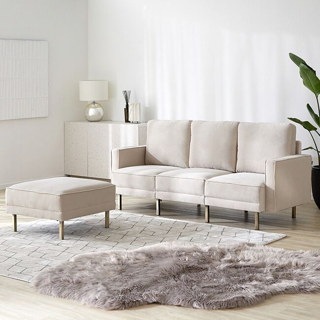 ゆったり3人掛けのベルベット調ソファ。細身のゴールド脚やすっきりとした美しい背面にもこだわり、品のあるシンプルなデザインに仕上げました。