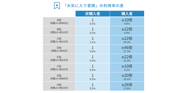 「お気に入り登録」の利用率の差はより大きく、最小で約10倍、最大で約46倍も違いがありました。