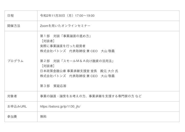 本セミナーでは、バトンズ社長の大山と、実際に事業を譲渡された経営者の方との対談を通じて、「事業譲渡のメリットや進め方」等をお伝えします。さらに、事業を譲り受ける際に課題となる「資金調達」の方法についても、日本公庫と大山との対談形式にて解説します。
