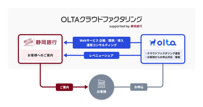 OLTAと静岡銀行とのクラウドファクタリングの共同事業は、互いの強みを活かした共創型の事業モデルです。OLTAがWebサービスの企画・開発・導入および運用におけるコンサルティングを静岡銀行に提供し、静岡銀行は自社ブランドの金融商品のサービスラインナップに加え、法人・個人事業主のお客様にご案内します。