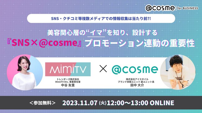 トレンダーズ株式会社(所在地:東京都渋谷区、代表取締役社長:黒川涼子、東証グロース上場:証券コード6069)が運営する美容メディア「MimiTV」は、株式会社アイスタイル(本社:東京都港区、代表取締役社長 遠藤宗、東証一部上場:証券コード3660)が運営する国内最大級の美容情報メディア「@cosme」と、無料マーケティングウェビナー「美容関心層の“イマ”を知り、設計する 『SNS×@cosme』プロモーション連動の重要性」を、2023年11月7日(火)に共催いたします。