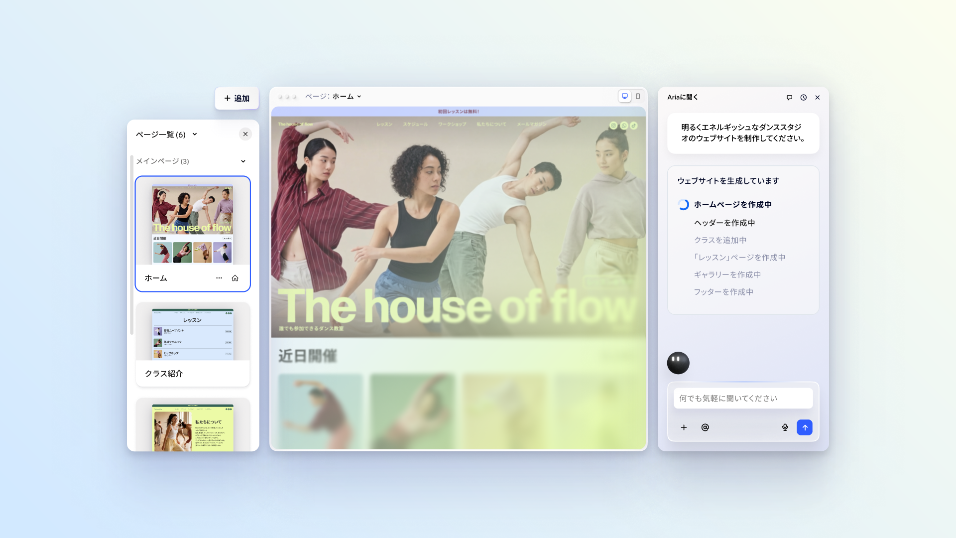 Aria は、一度きりの自動生成にとどまらず、エディタ全体で継続的に機能する AI アシスタントです。サイトの目的や構造を理解し、コンテンツの作成や、デザインの最適化、機能追加を会話ベースで支援します。さらに操作や挙動がどうなるかを説明し、問題や改善点を知らせます。最終的な判断とコントロールは常にユーザー側に残ります。