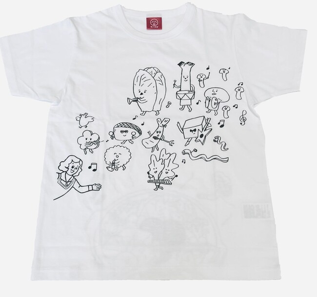 フロントにはとり野菜みそのパッケージに描かれているキャラクター「まつや とり」を先頭に鍋の食材たちが明るく楽しく行進中。バックでは食材たちがみんなで仲良く鍋に入っています。