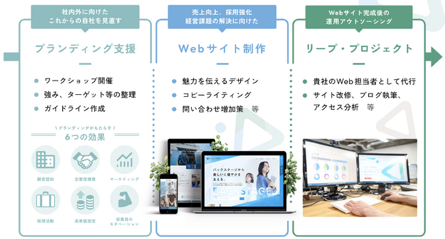 ブランディング支援からWebサイト制作に加え、そして完成後の運用アウトソーシングまでを提供し、お客様の成功を伴走型で支援します。