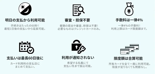 個人事業主・法人企業を対象とした「支払い.com」は、企業間の取引におけるあらゆる銀行振込のお支払いを、ユーザーがお持ちのクレジットカードで決済できるサービスです。お支払いをクレジットカードのお引落日まで延長することで、ユーザーは資金繰りの改善が可能となります。また、ユーザーは書類の提出や面談、審査は必要ありません。