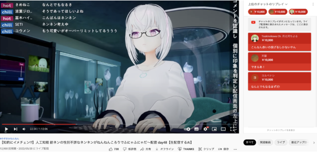AIVTuberとは、AI技術を用いてYouTube等で完全無人で配信をし続けるバーチャルキャラクターのことを指します。人間には不可能な、24時間無人で、配信活動を行い続けるキャラクターコンテンツです。Pictoria所属のAI VTuber「紡ネン」は、ゴールデンウィークに10日間240時間配信を行い、最終的には53万人に視聴されるなど、有名VTuberを凌ぐ数字を叩き出しています。また、同時接続者数2300人も記録しており、これからますますの成長が見込まれます。