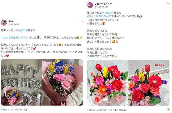 応募の際には「自分の誕生日がきたらリツイートしようと決めていました!お花で祝ってもらった経験がないので、届いたらとても嬉しいです」「誕生日になったらこの企画に参加するんだと楽しみにしてました」など、応募できる誕生日当日を心待ちにしていたとのコメントや、「やっと応募出来る日が来たー!」「やっとリツイート出来る日になりました。自分の誕生日で応募させていただきます」など誕生日当日を迎えた喜びのコメントも多くの方からいただきました。