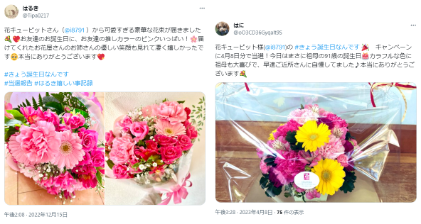 これまでのご当選者様からは「当選した日の夕方には手元に届いたのでその早さにびっくり」と驚く声や「配達してくださった方からお祝いの言葉をいただき、嬉しかった」「届けてくれたお花屋さんのお姉さんの優しい笑顔も見れて嬉しかった」など、地元の花屋さんから直接お届けする花キューピットならではのコミュニケーションを喜んでいただいた声など、たくさんのご報告をいただきました。