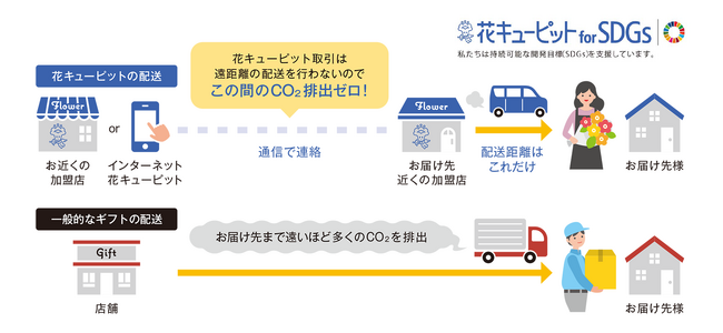 遠距離の配送を行わずにお届け先近くの加盟店からお届けするため、その配送しなかった距離分のCO2排出抑制に貢献しています。また段ボール等の梱包材の使用が最小限で済み、環境保護にもつながっています。直近1年間(2022.4-2023.3)では花キューピットグループ全体(国内)でCO2に換算すると約150tの排出を抑制※いたしました。※注文店舗から配送店舗までの直線距離を積算しております(期間2022年4月〜2023年3月)。また、その距離を軽油10tトラックで輸送した想定の上、改良トンキロ法を使って算出しました。(監修:工学博士 西尾匡弘氏…国立研究開発法人 産業技術総合研究所 エネルギー・環境領域ゼロエミッション研究戦略部・イノベーションコーディネーター)