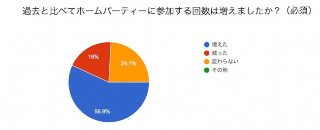56.9%の人が「増えた」と回答。これまで以上にホームパーティーへの参加率と、関心が高まり、ホームパーティー人口が増加していることがわかります。