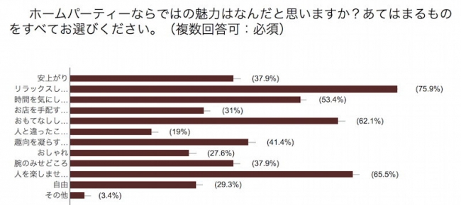 ホームパーティーの魅力として、最も回答が多かったのが「リラックスして楽しめる」の75.9%。同様に「時間を気にしないで済む」53.4%など、外食で会場の状況に左右されず、落ち着いて楽しめるという点を多くの方が支持していることがわかります。また、一方で、「人を楽しませたい」の65.5%。「おもてなししたい」62.1%。といった、友人、知人に対するサービス、おもてなしの形としてのホームパーティーの魅力を上げる方も多数になりました。心地よい空間で自分なりのパーティーが開けること、それによって友人、知人へ、自分なりのサービスができるところが、ホームパーティーの楽しみ方のポイントとなるようです。
