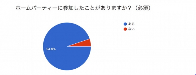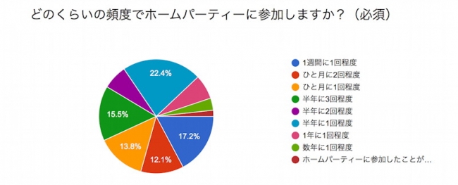 94.8%の方がホームパーティーに参加したことがあると回答。また、参加頻度も「1週間に1回」と答えた方が17.2%にものぼりました。「ひと月に2回」と答えた方が12.1%。さらに「ひと月に1回」と答えた方、13.8%を加えると、43.1%の方が「ひと月に1回以上、ホームパーティーに参加している」という結果となりました。