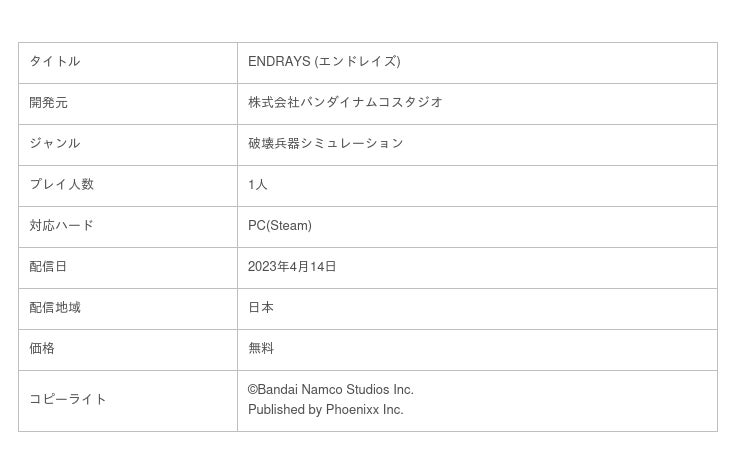 4月14日 (金) 『ENDRAYS (エンドレイズ)』 :https://store.steampowered.com/app/2213560/