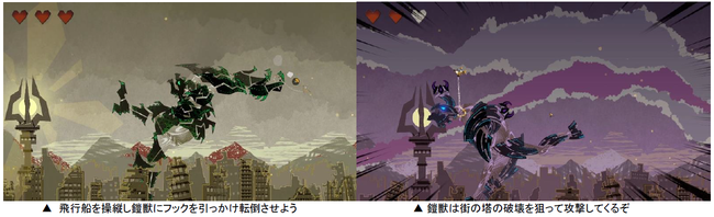 フックのついた飛空船を操り、塔の破壊を目論む鎧獣を転倒させよう。