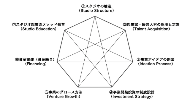 ??quantumが本プロジェクトで提供するメソッドより、地域銀行にスタートアップ・スタジオを内部組成するために必要な7つの要素をまとめた図式。連続的に事業を生み出すためのスタジオの構造設計から、アイディエーション、グロースまで、スタジオ活動において欠かすことのできない要素を整理した。7つの要素それぞれについて、これまで培ってきた知見に基づくメソッドを実装する。